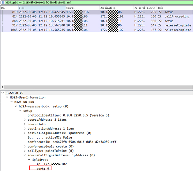 5、返回去再次查看SC的信令,发现终端带过来的setup消息中,端口号为0,端口为0时,SC就会把终端的IP和端口改为自己的,从而导致MCU侧处理失败;如果主叫带了正常的IP和端口,SC就只做纯转发,如果带的不全,SC就会改成自己的IP+端口;